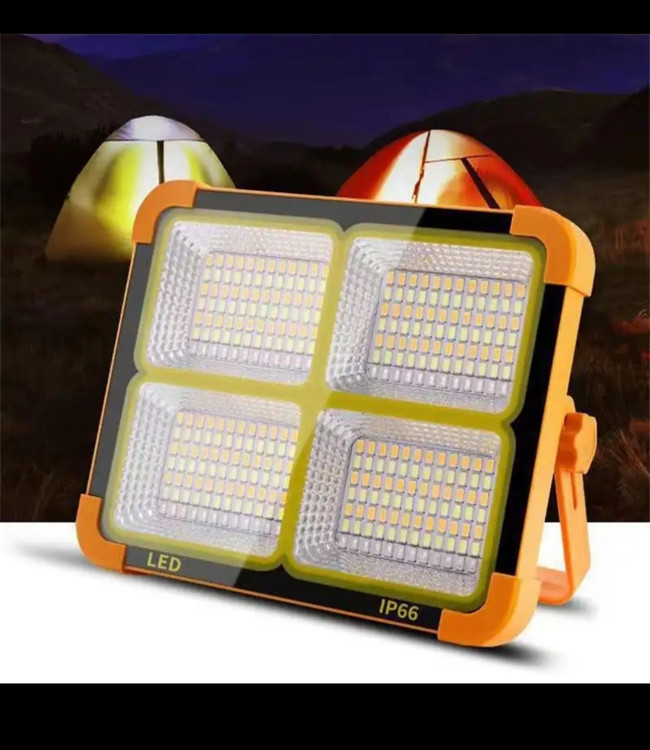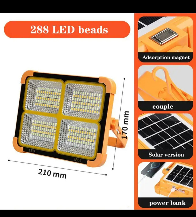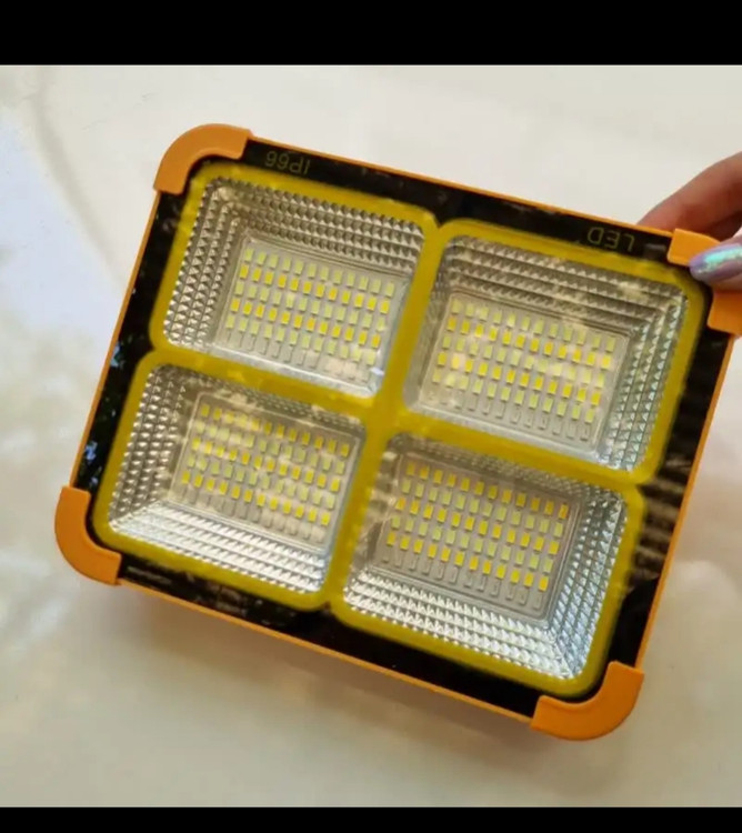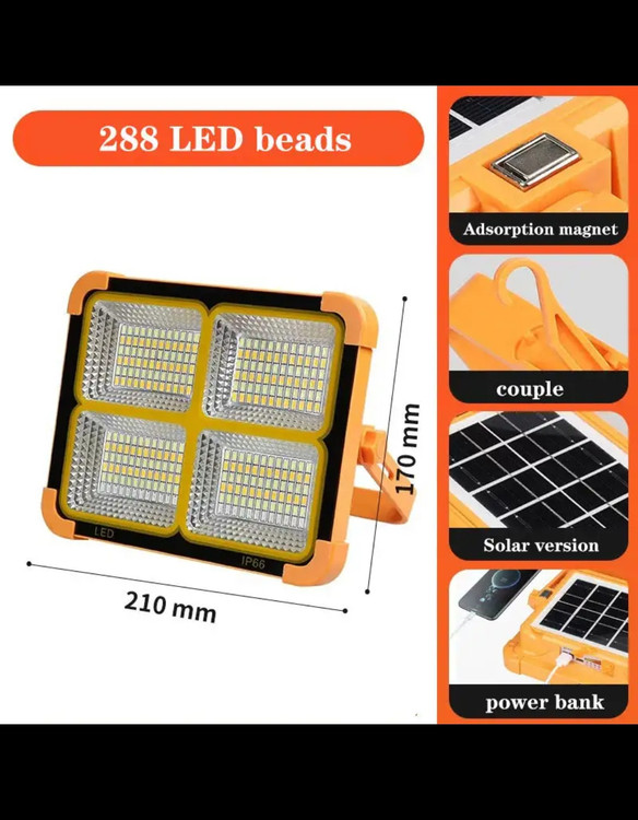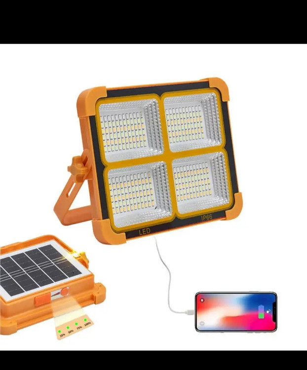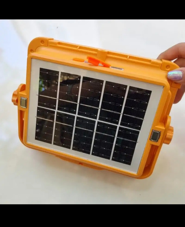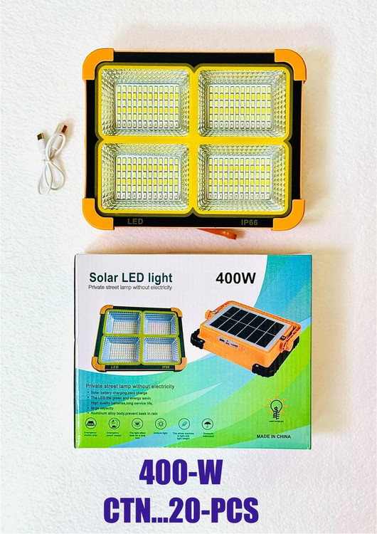 لامپ سولارLEDشارژی مدل 400w نوعی چراغ قابل حمل با پنل خورشیدی میباشد لامپ سولار LED شارژی یک راهکار مدرن اقتصادی برای روشنایی محیط های بیرونی و داخلی است این چراغ خورشیدی با استفاده از پنل خورشیدی با کیفیت انرژی خورشیدی را در طول روز جذب و در باتری داخلی ذخیره میکند تا در شب ها بدون نیاز به برق روشنایی قدرتمند و یکنواخت ارائه دهد به لطف طراحی ضد گردوغبار (IP65) این لامپ سولار در هر شرایط آب و هوایی از روزهای بارانی گرفته تا گرمای شدید به خوبی کار میکند این محصول برای حیاط باغ پارکینگ بالکن کمپینگ مسافرت و کوهنوردی و مواقع اضطراری انتخابی ایدهآل است این محصول با نور فوقالعاده در چهار حالت آفتابی مهتابی وحالت چشمک زن آبی و قرمز (پلیسی)در زمانهای اظطراری مورد استفاده قرار میگیرد این دستگاه هم با برق و هم با برق و هم با پنل خورشیدی