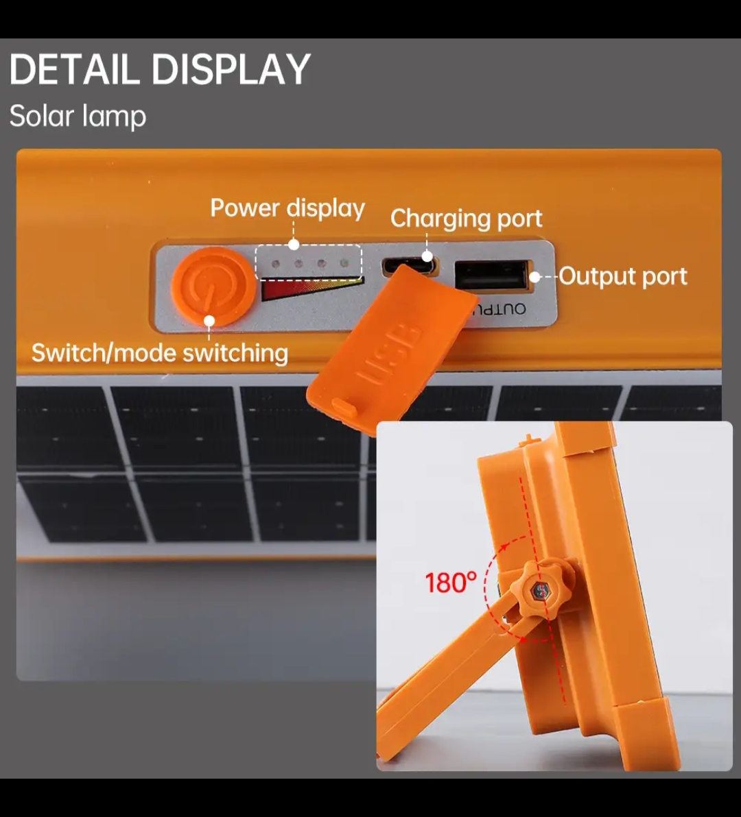 لامپ سولارLEDشارژی مدل 400w نوعی چراغ قابل حمل با پنل خورشیدی میباشد لامپ سولار LED شارژی یک راهکار مدرن اقتصادی برای روشنایی محیط های بیرونی و داخلی است این چراغ خورشیدی با استفاده از پنل خورشیدی با کیفیت انرژی خورشیدی را در طول روز جذب و در باتری داخلی ذخیره میکند تا در شب ها بدون نیاز به برق روشنایی قدرتمند و یکنواخت ارائه دهد به لطف طراحی ضد گردوغبار (IP65) این لامپ سولار در هر شرایط آب و هوایی از روزهای بارانی گرفته تا گرمای شدید به خوبی کار میکند این محصول برای حیاط باغ پارکینگ بالکن کمپینگ مسافرت و کوهنوردی و مواقع اضطراری انتخابی ایدهآل است این محصول با نور فوقالعاده در چهار حالت آفتابی مهتابی وحالت چشمک زن آبی و قرمز (پلیسی)در زمانهای اظطراری مورد استفاده قرار میگیرد این دستگاه هم با برق و هم با برق و هم با پنل خورشیدی