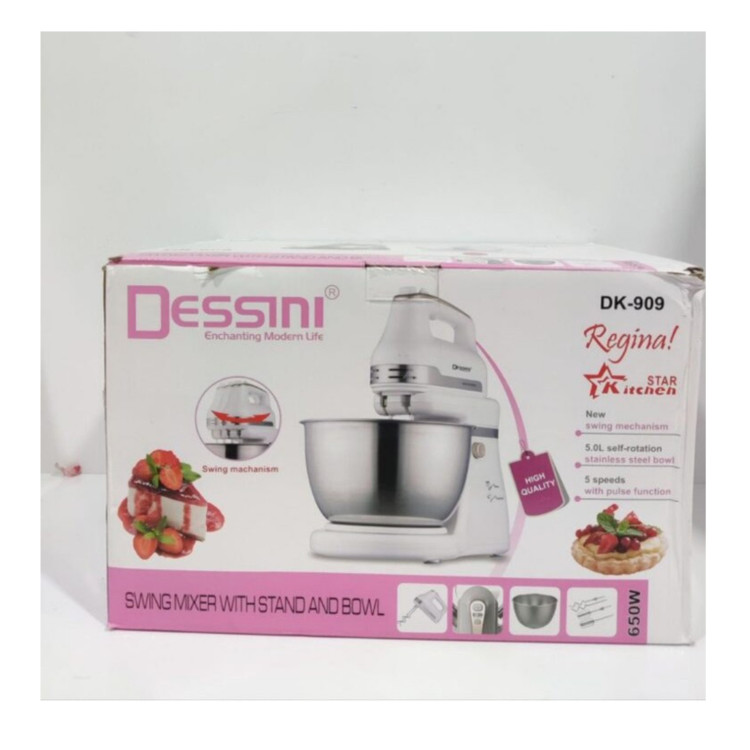 همزن کاسه دار دسینی مدل 909 «DK-909» گردشی چرخشی مجهز به توان مصرفی 650 وات و ظرفیت 5 لیتر می باشد. پس در هر بار استفاده از این محصول می توان حجم زیادی از مواد را درون کاسه ی همزن مخلوط کرد. برای تهیه ی شیرینی و دسر های مختلف یکی از کاربردی ترین محصولات در هر خانه ایی است. همزن کاسه دار دسینی مدل 909 دارای 5 سرعت مختلف می باشد. یکی از قابلیت های همزن دسینی مدل 909 دارای عملکرد توربو بوده و می توان از حداکثر سرعت این محصول برای مواد های سخت و سفت استفاده کرد. همچنین کاسه ی این همزن دسینی دارای ثابلیت چرخش به چپ و راست است.
